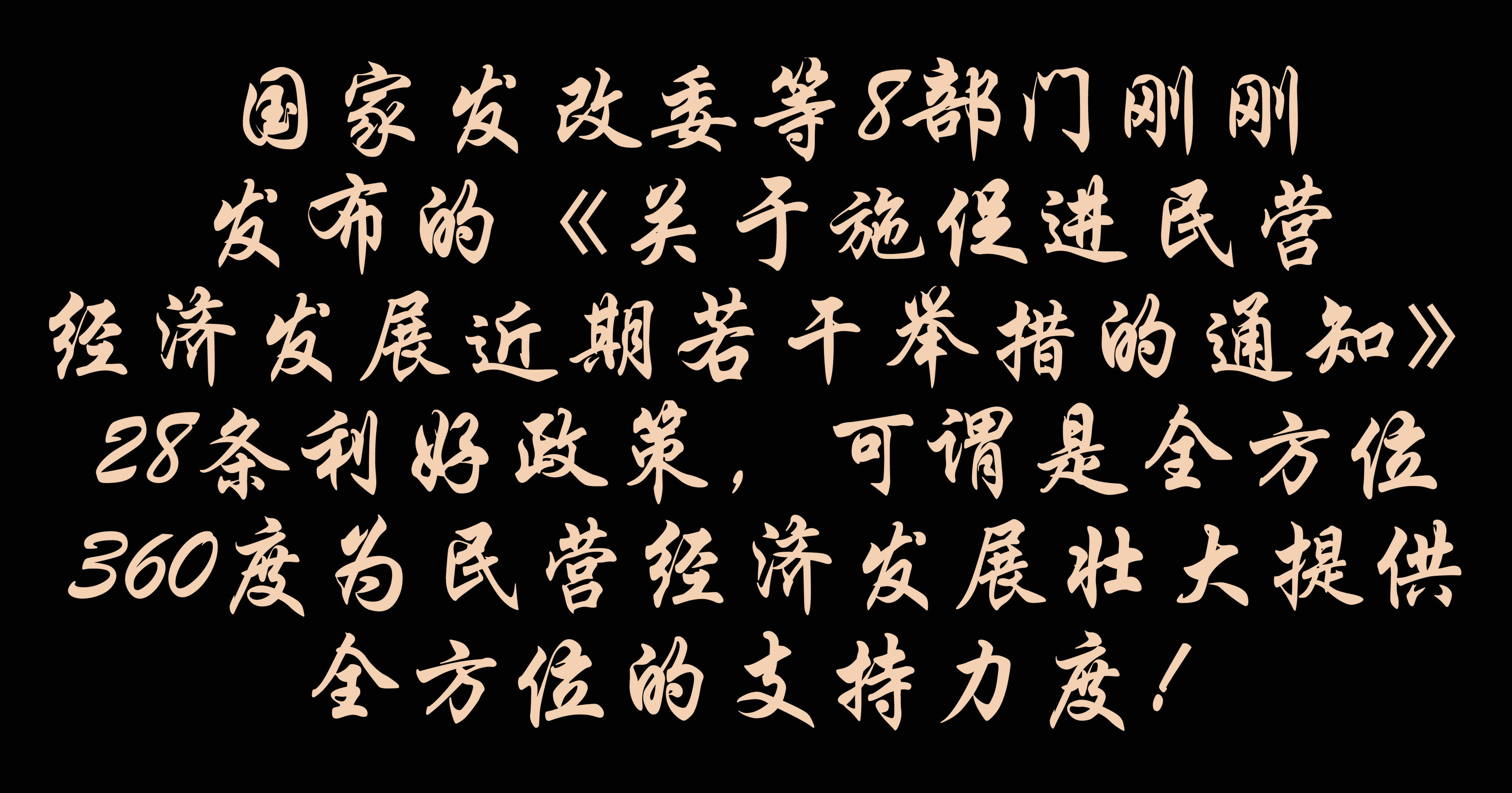 國家發(fā)改委等8部門剛剛發(fā)布的《關(guān)于實(shí)施促進(jìn)民營經(jīng)濟(jì)發(fā)展近期若干舉措的通知》28條利好政策,可謂是全方位360度為民營經(jīng)濟(jì)發(fā)展壯大提供全方位支持的力度,對于民營企業(yè)來說可謂是千載難逢的機(jī)遇期,對于民營企業(yè)家來說可謂是定心丸和助跑器,把做大做強(qiáng)自己的企業(yè)作為一種使命和任務(wù),這才是對國家和民族義不容辭的責(zé)任的最好行動!