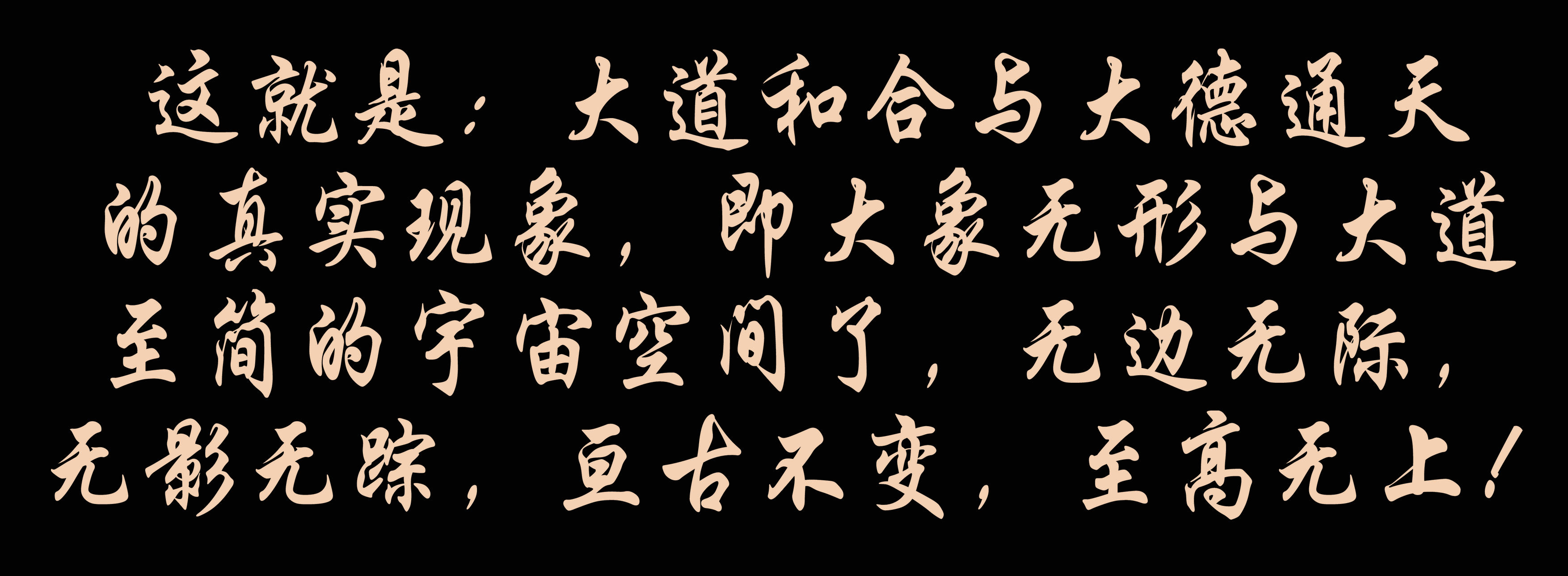 這就是:大道和合與大德通天的真實現(xiàn)象,即大象無形與大道至簡的宇宙空間了,無邊無際,無影無蹤,亙古不變,至高無上!