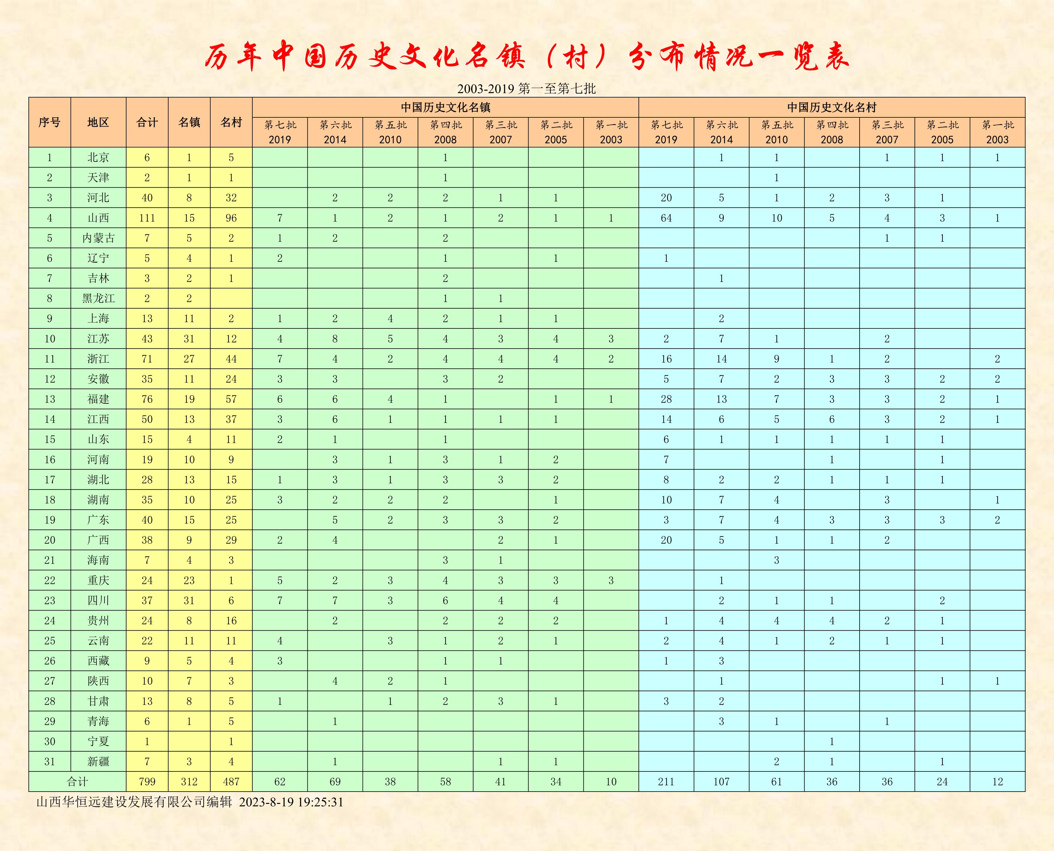 下午,完成了《全國歷史文化名鎮(zhèn)(村)名錄》的分布情況一覽表,山西省以111個名鎮(zhèn)名村,位居第一名!