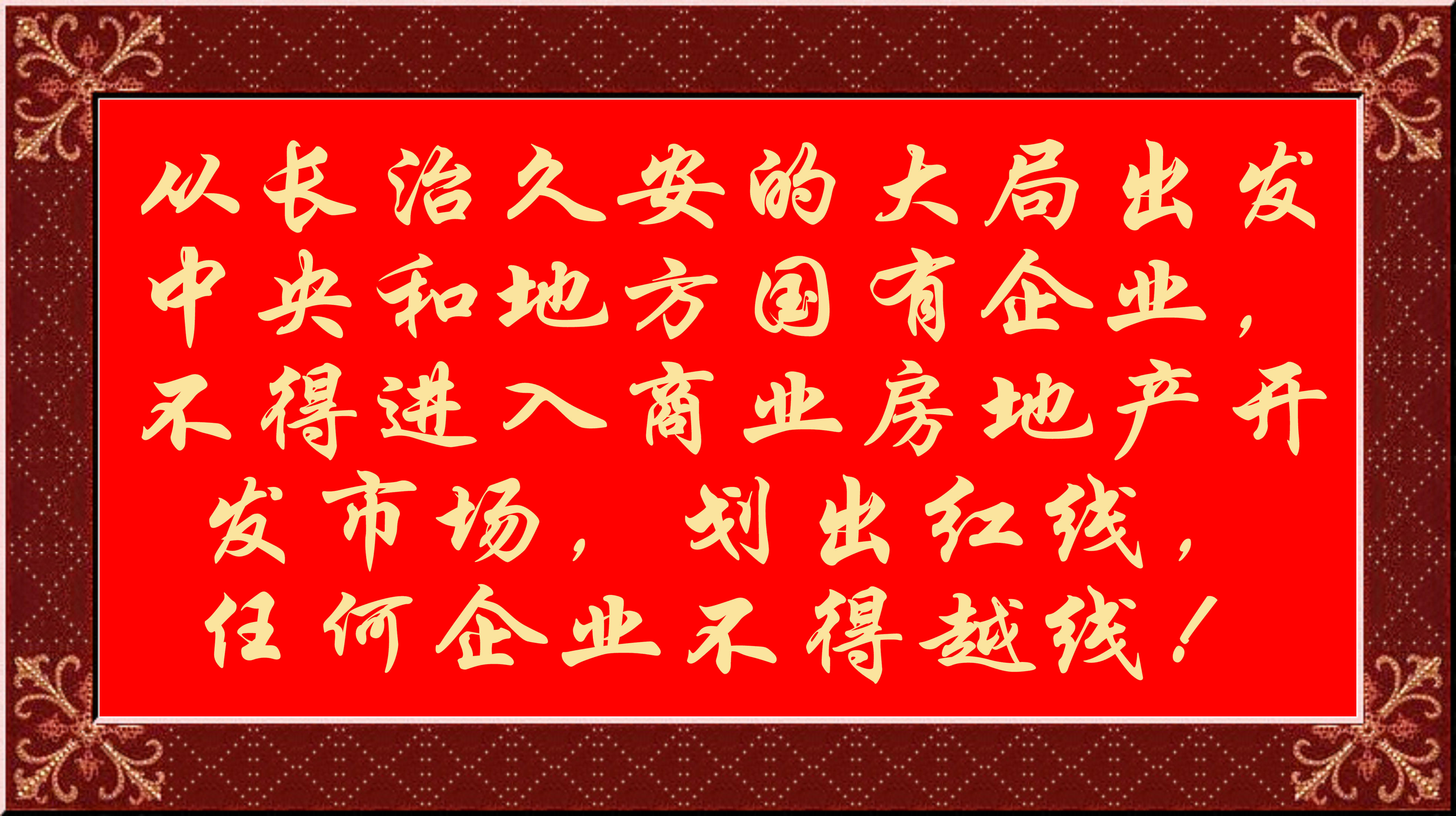 感應(yīng)房地產(chǎn)業(yè)回歸正常發(fā)展渠道,安居樂(lè)業(yè)是國(guó)家穩(wěn)固永恒的使命,應(yīng)該從長(zhǎng)治久安的大局出發(fā),嚴(yán)格房地產(chǎn)業(yè)宏觀管理,中央和地方國(guó)有企業(yè),不得進(jìn)入商業(yè)房地產(chǎn)開(kāi)發(fā)市場(chǎng),劃出紅線,任何企業(yè)不得越線!