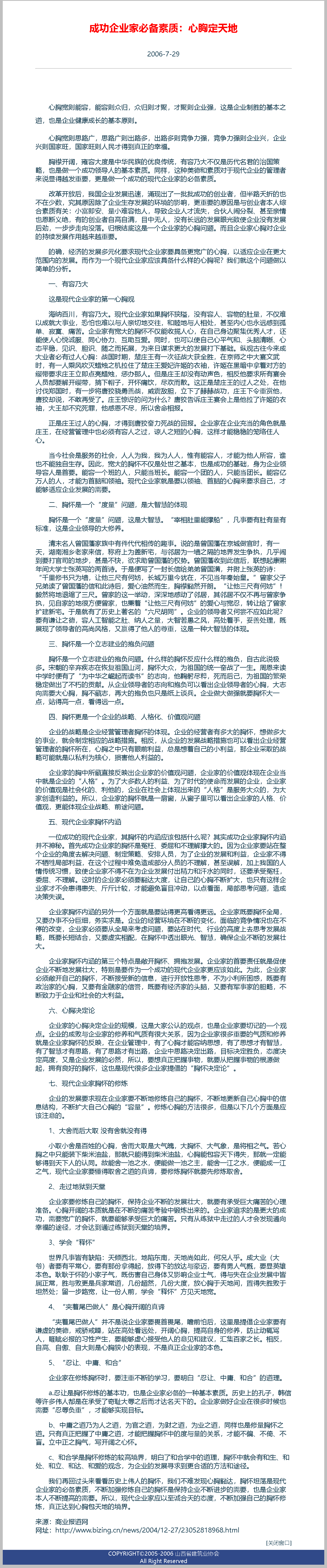 改革開放后,我國企業(yè)發(fā)展迅速,涌現(xiàn)出了一批批成功的創(chuàng)業(yè)者,但半路夭折的也不在少數(shù),究其原因除了企業(yè)生存發(fā)展的環(huán)境的影響,更重要的原因是與創(chuàng)業(yè)者本人綜合素質(zhì)有關(guān):小富即安、量小難容他人,導(dǎo)致企業(yè)人才流失,合伙人鬧分裂、甚至親情也恩斷義絕,有的創(chuàng)業(yè)者自高自滿,目中無人,沒有長遠(yuǎn)的發(fā)展眼光致使企業(yè)沒有發(fā)展后勁,一步步走向沒落。歸根結(jié)底這是一個企業(yè)家的心胸問題。而且企業(yè)家心胸對企業(yè)的持續(xù)發(fā)展作用越來越重要。