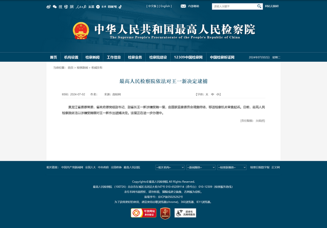 新華社北京7月2日電 記者2日從最高人民檢察院獲悉,黑龍江省委原常委,省政府原黨組副書(shū)記、副省長(zhǎng)王一新涉嫌受賄一案,由國(guó)家監(jiān)察委員會(huì)調(diào)查終結(jié),移送檢察機(jī)關(guān)審查起訴。日前,最高人民檢察院依法以涉嫌受賄罪對(duì)王一新作出逮捕決定。該案正在進(jìn)一步辦理中。